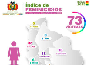 Respecto a los casos de Feminicidio, se reporta 73 víctimas, el departamento de La Paz con 30 víctimas, seguido por Santa Cruz con 16 y Cochabamba con 11, mientras que Oruro y Potosí tienen 6 cada uno, Tarija 3 y Chuquisaca 1.