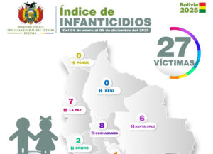 La extrema violencia también afecta a los más vulnerables debido que se registran 27 víctimas de Infanticidio en 25 casos. Cochabamba reporta el mayor número de víctimas con 8, seguido por La Paz con 7, Santa Cruz 6, Potosí 3, Oruro 2 y Chuquisaca 1.