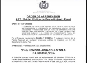 La Fiscalía emitió una orden de aprehensión contra la exministra Nemecia Achacollo en el marco de la investigación por el presunto desvío de fondos del Fondo Indígena. El mandamiento, fundamentado en el Código de Procedimiento Penal, instruye su captura para que declare como sindicada.